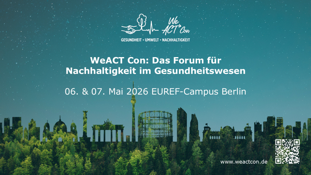 Bereits zum dritten Mal in Folge sind wir Programmpartner der WeACT CON, dem Forum für Nachhaltigkeit im Gesundheitswesen, und übernehmen auch in diesem Jahr die Gestaltung eines interaktiven Diskussionsforums. Der Programmpunkt schafft einen offenen Raum für Austausch, Einordnung und gemeinsame Reflexion und lädt das Publikum ausdrücklich zur aktiven Mitwirkung ein. Durch verschiedene interaktive Elemente werden unterschiedliche Perspektiven sichtbar, Positionen geschärft und zentrale Fragestellungen gemeinsam mit den Teilnehmenden vertieft diskutiert. Weitere Details folgen in Kürze.